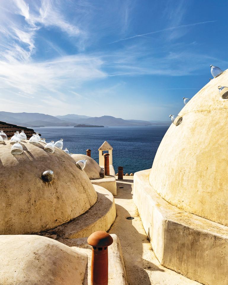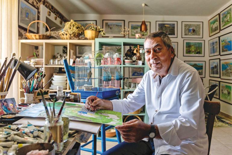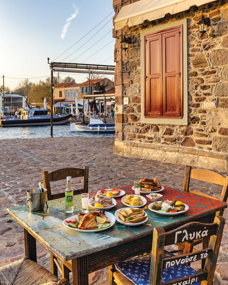 Before reaching the charming little harbour with its fish tavernas redolent of the sea and an ouzo carafe, I encounter two notable figures: Vasilis Titirekis, the president of O Molyvos (a cultural association of traditional dances), an organisation that holds exceptional festivals each year, featuring dancing groups from every corner of Greece. Then I encounter Stelios Kouniaris, a self-taught painter otherwise known as “modern Theophilos,” (a reference to the Greek folk artist), as those familiar with his marvellous works call him. Twilight descends, and everything glows – the streets, the churches, the castle, the saltworks, the boats, and above all, the people.
